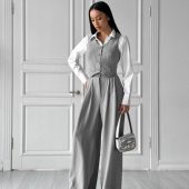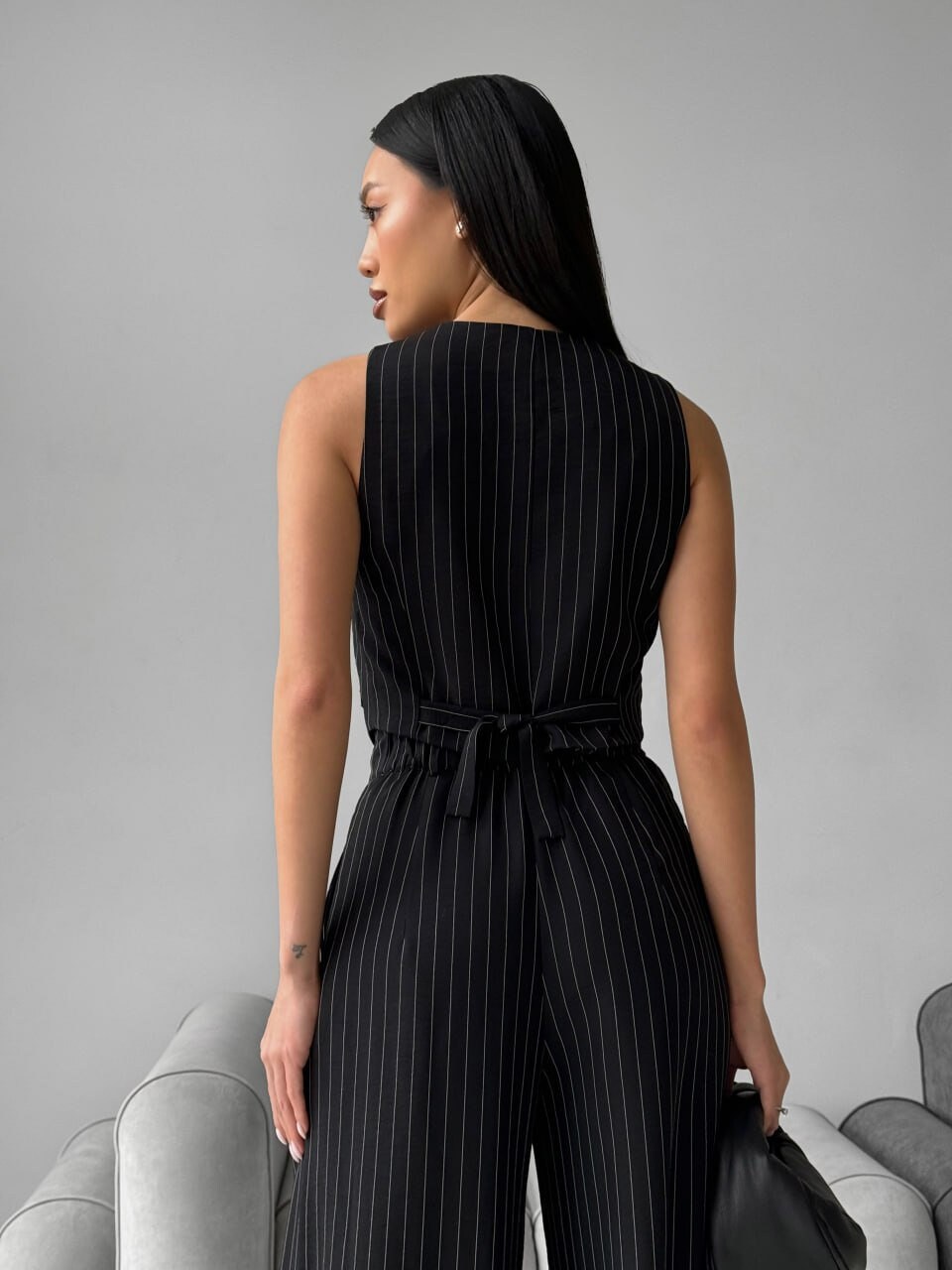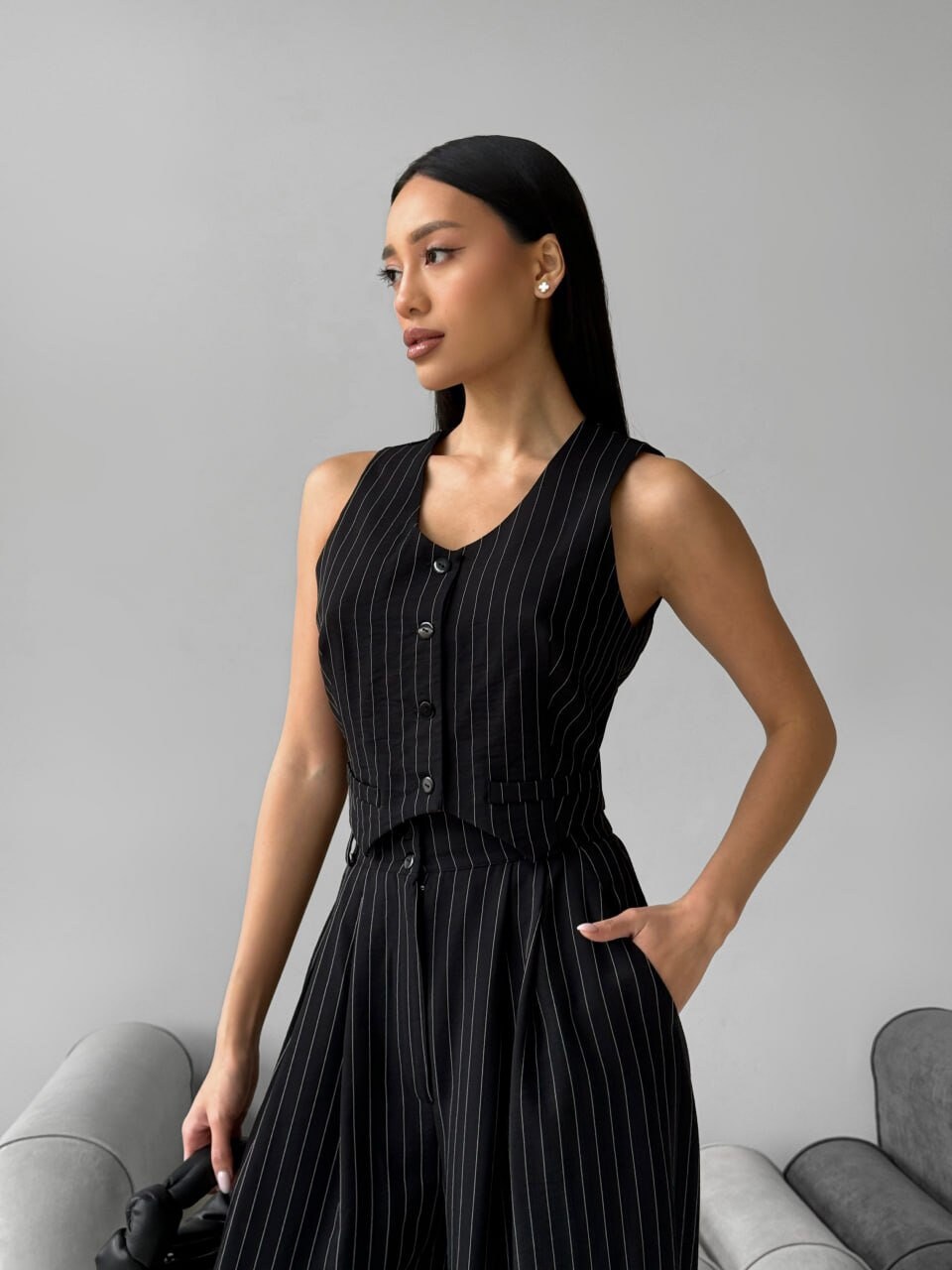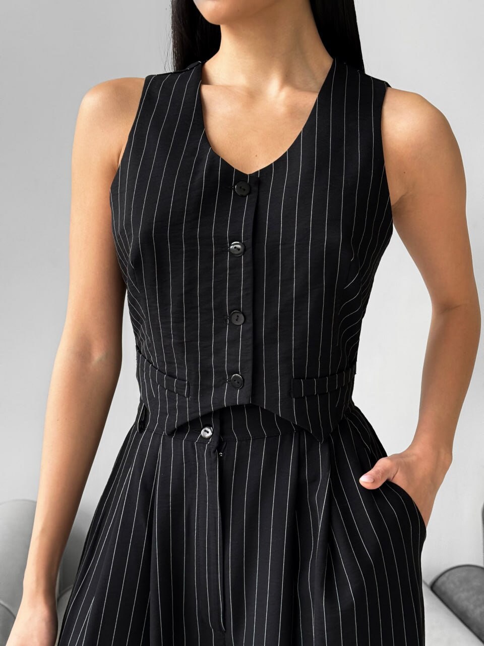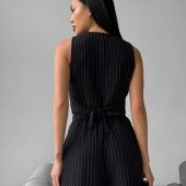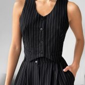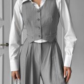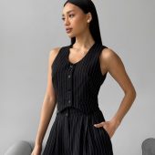 A basic waistcoat made of suit fabric in a thin stripe is always elegant and refined. The classic cut of the model is complemented by mock pockets. The vest fastens with buttons in the front, and a tie on the back. The vest can be worn as an independent element of the image, or in combination with a shirt or blouse.