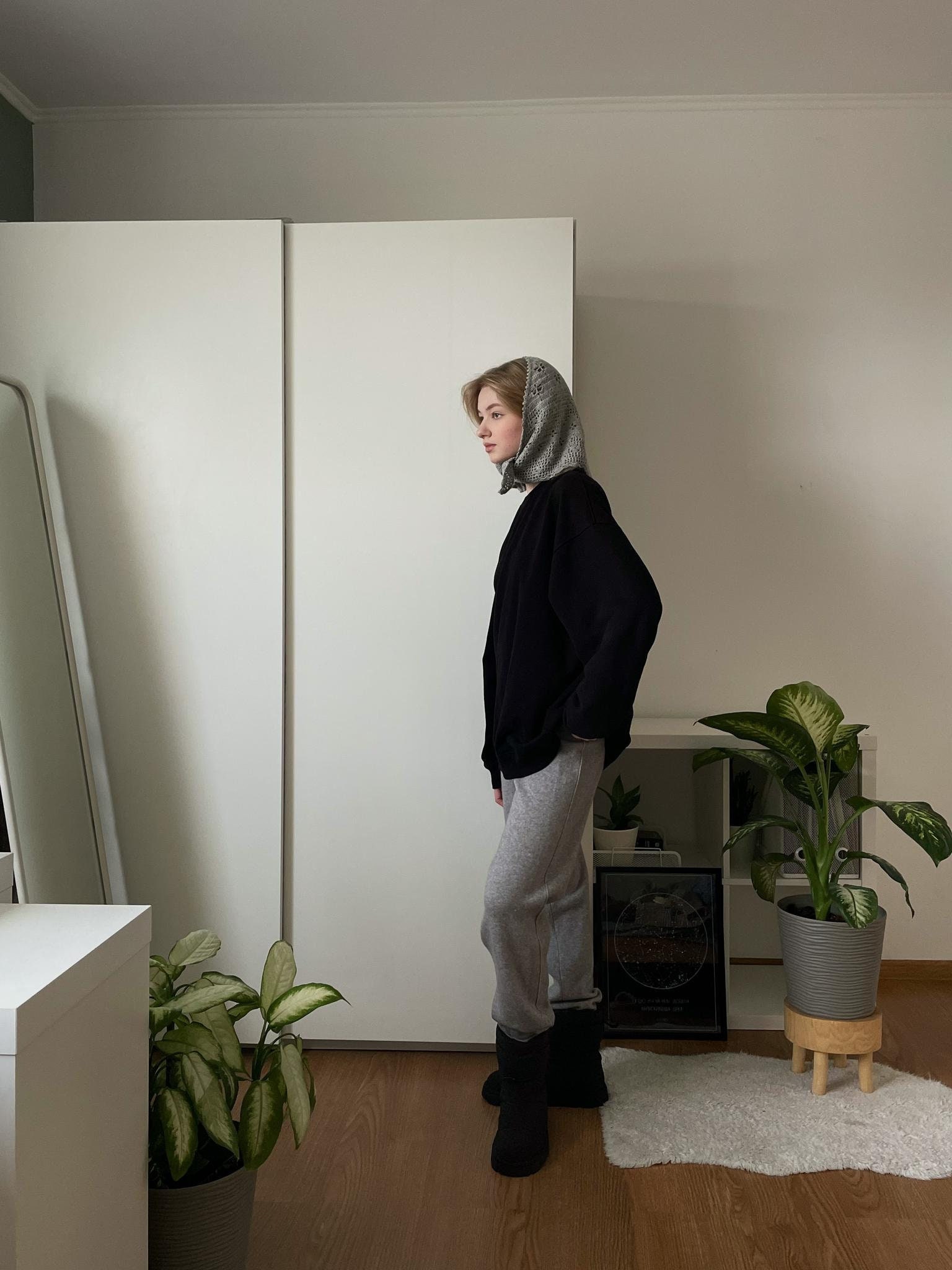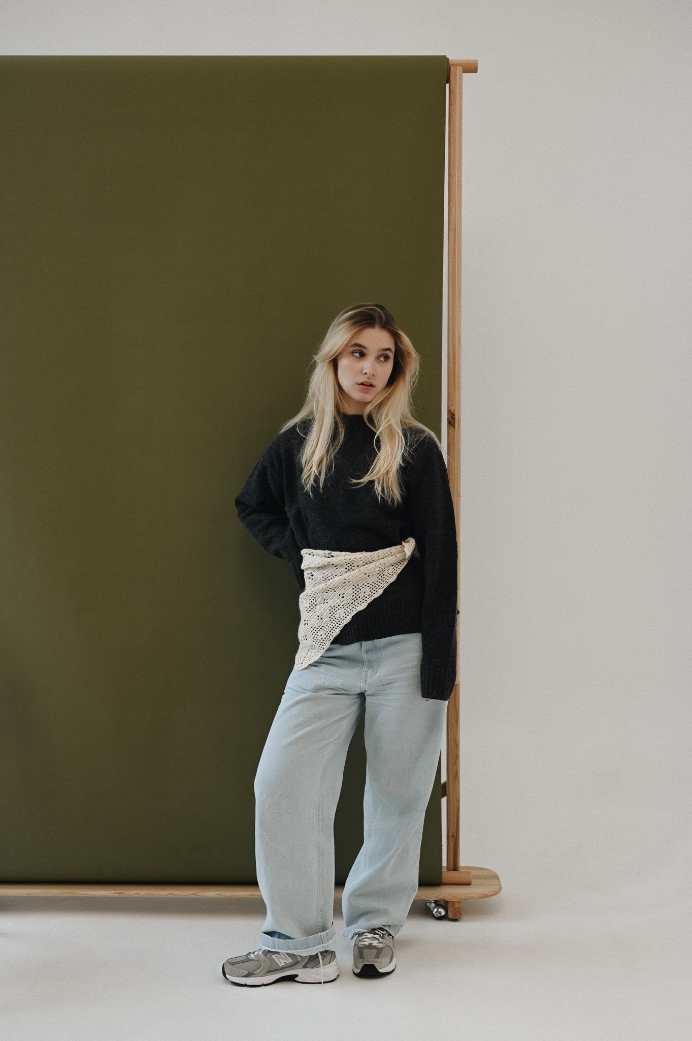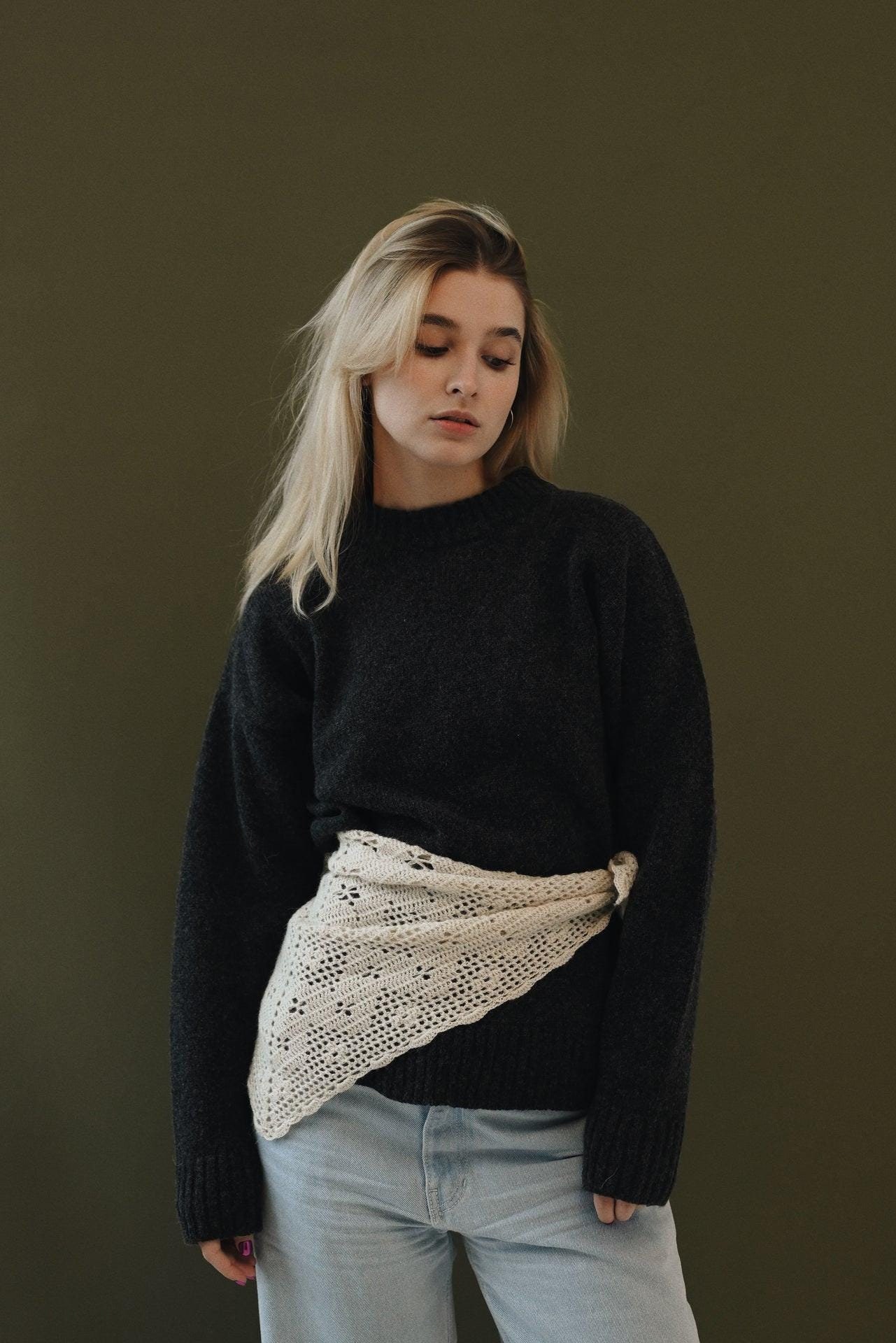 Our hand-knitted alpaca wool headscarf comes in milky and gray hues, featuring adjustable ties for a perfect fit. Wear it as a headband, neck accessory, or embellishment on a bag. Handcrafted and available in two sizes, it pairs beautifully with sweaters, dresses, suits, and outerwear for versatile styling options.