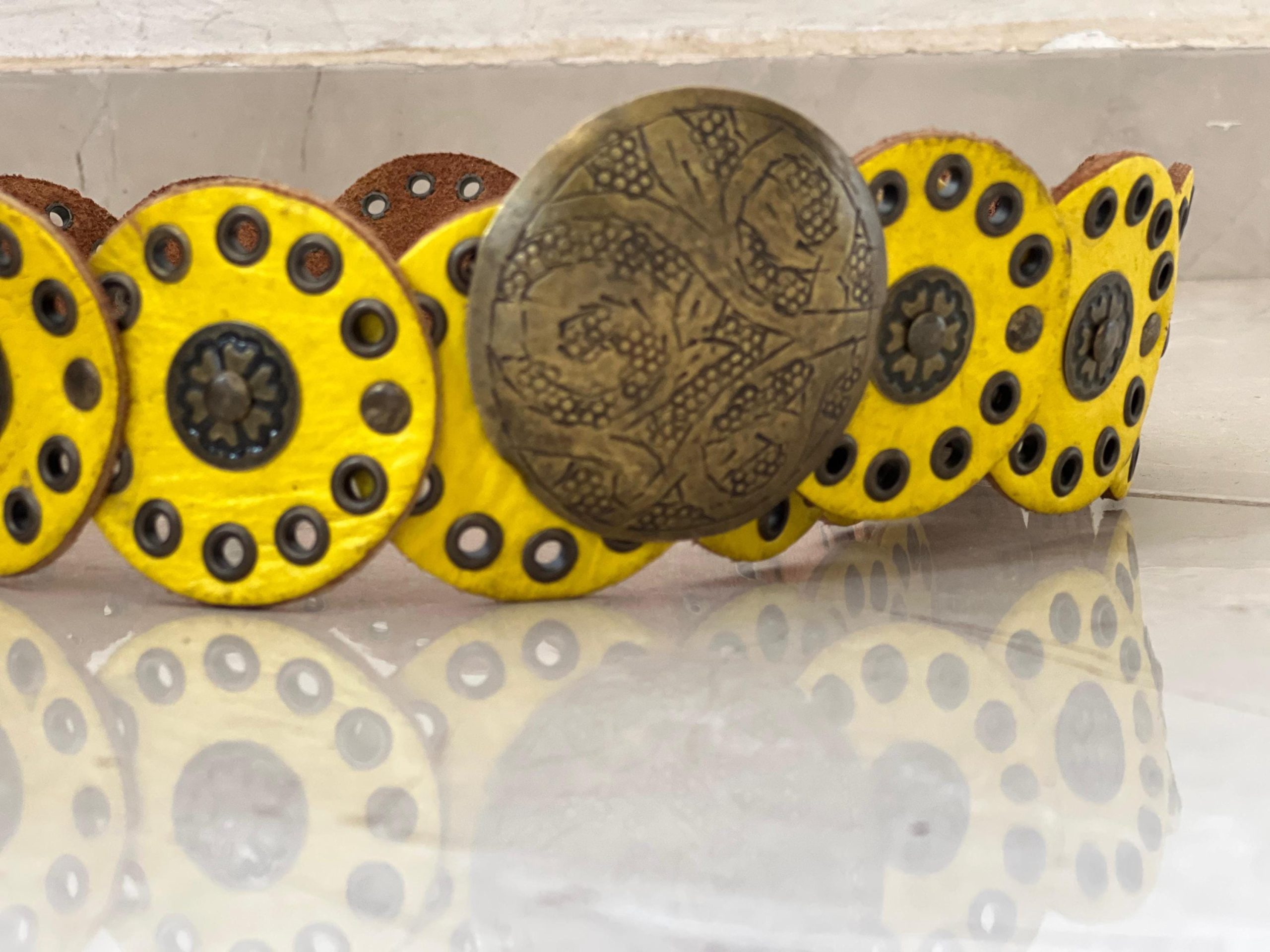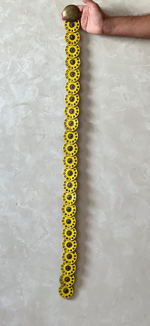 Bring a bold and unique touch to your outfit with this handmade Moroccan leather belt, designed with vibrant yellow leather circles and a detailed vintage-style buckle. Perfect as a boho statement belt, this piece adds a striking finish to casual looks or costume outfits. Its adjustable fit makes it versatile, whether you style it as a wide leather belt for women, a gothic leather belt for edgy fashion, or even as a standout Halloween costume belt.