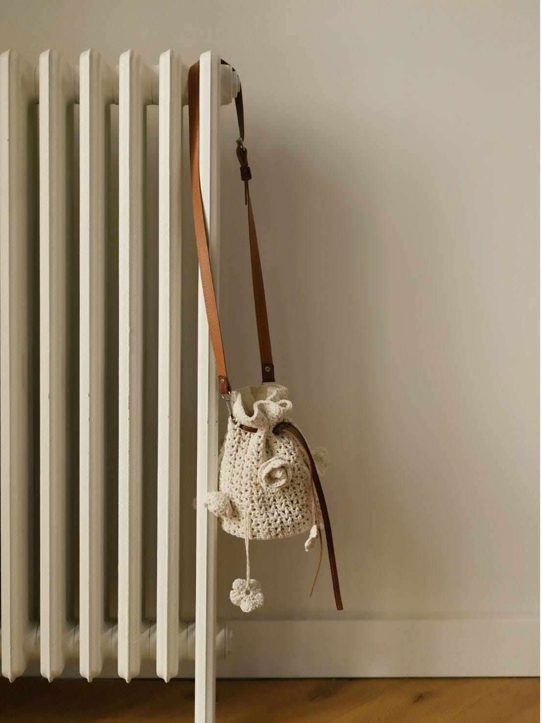 A handcrafted milky-colored bag with knitted flowers—made from natural materials, it features a unique texture that creates a cozy and elegant look. The voluminous floral elements add a touch of delicacy and originality, highlighting the craftsmanship and exclusive design. Brown leather handles complement the milky shade beautifully and ensure comfortable carrying. Spacious enough to hold all your essentials, yet compact and lightweight for everyday use.