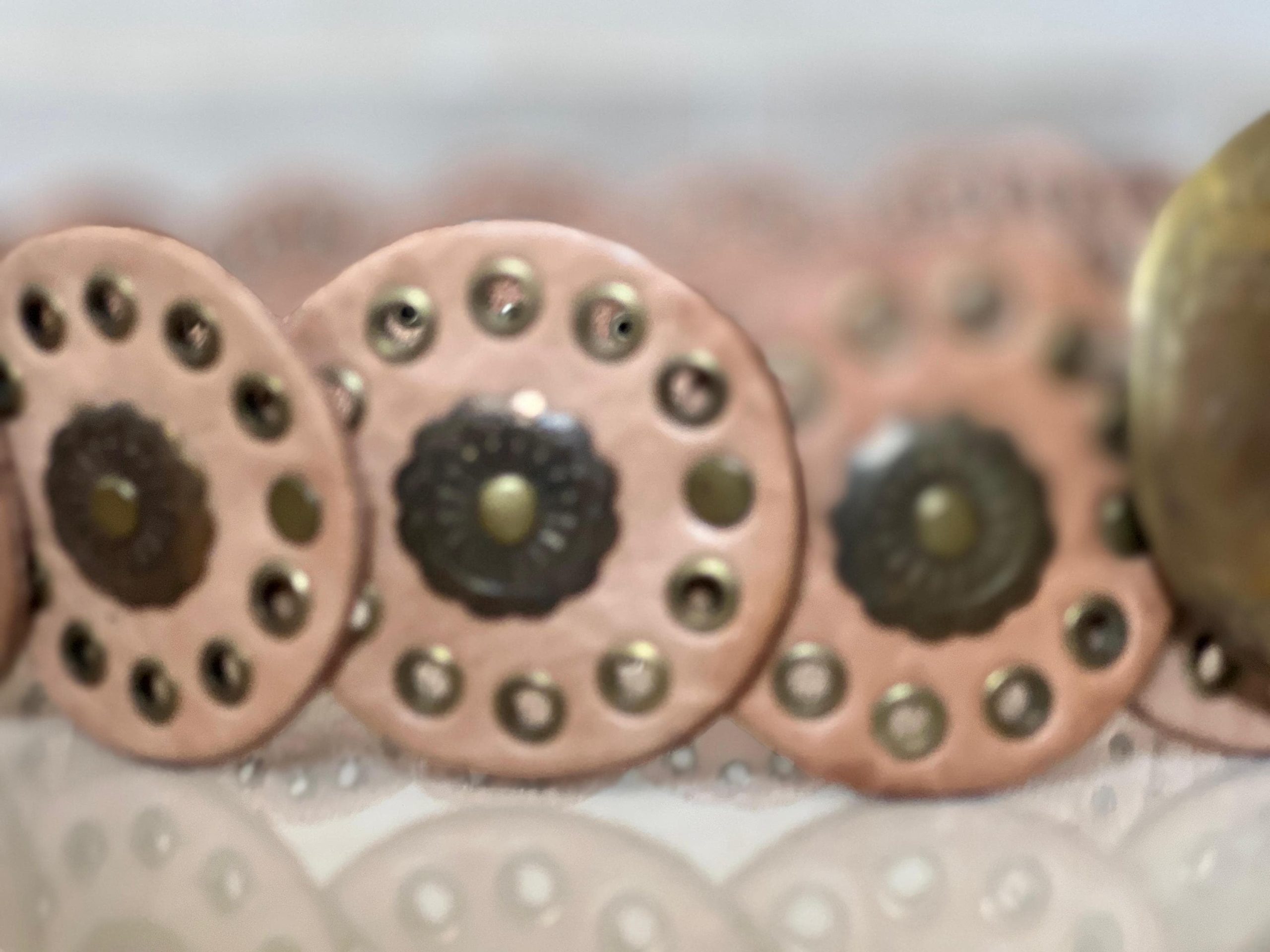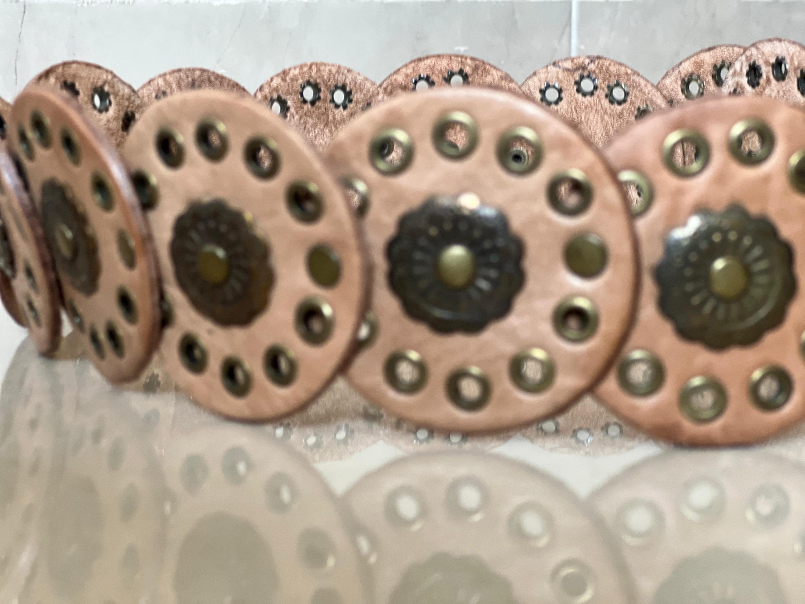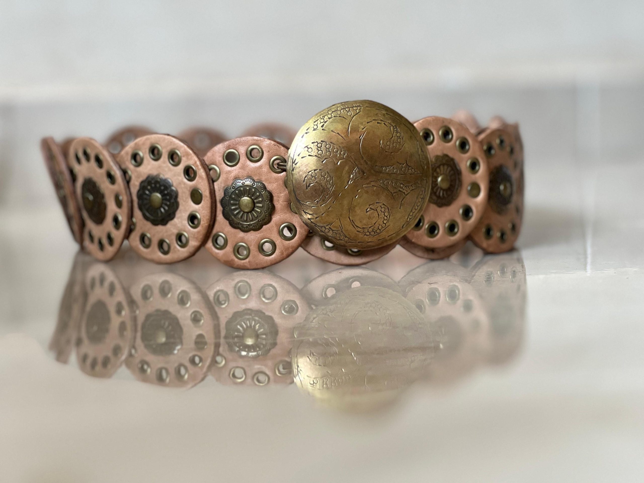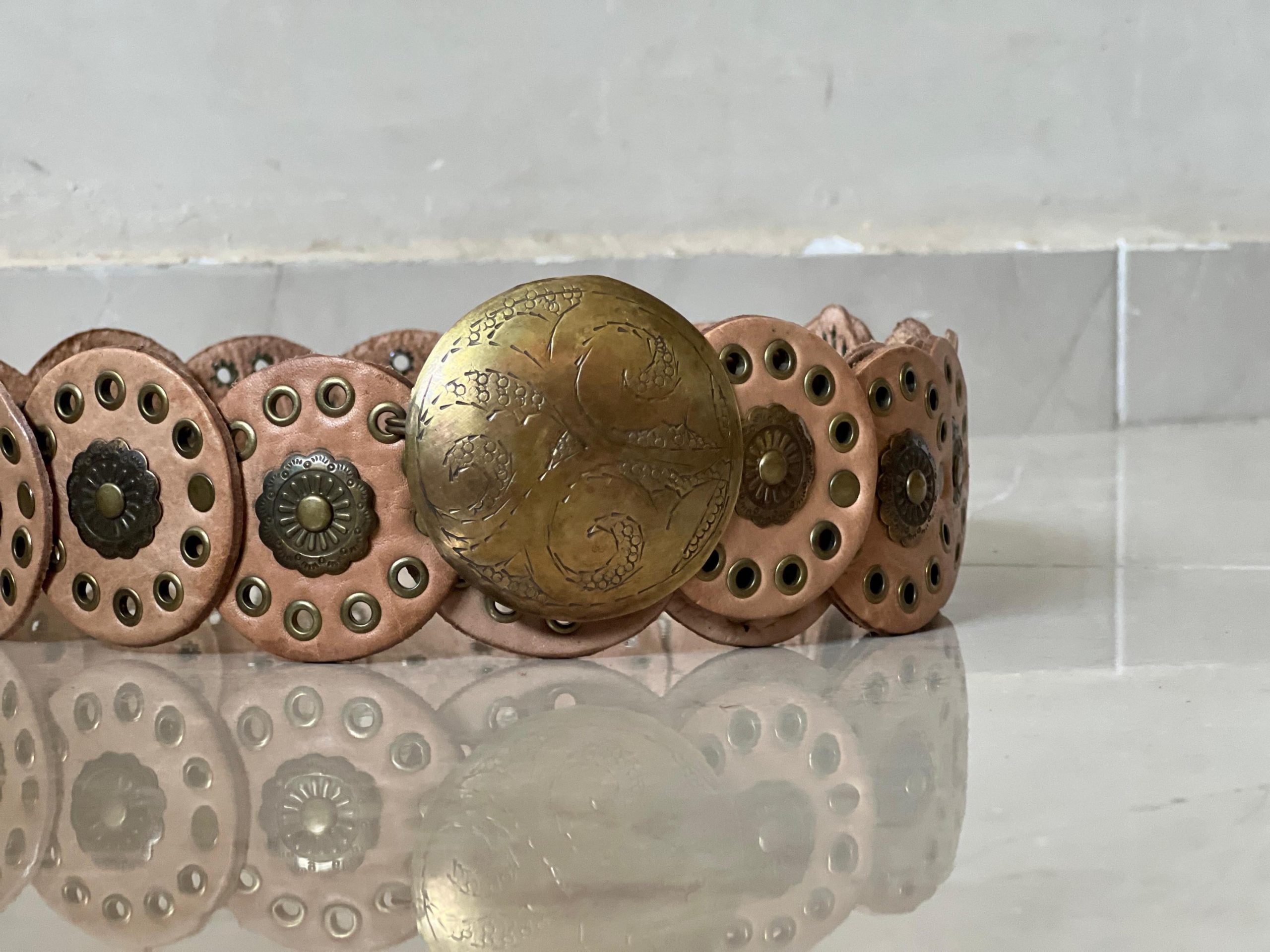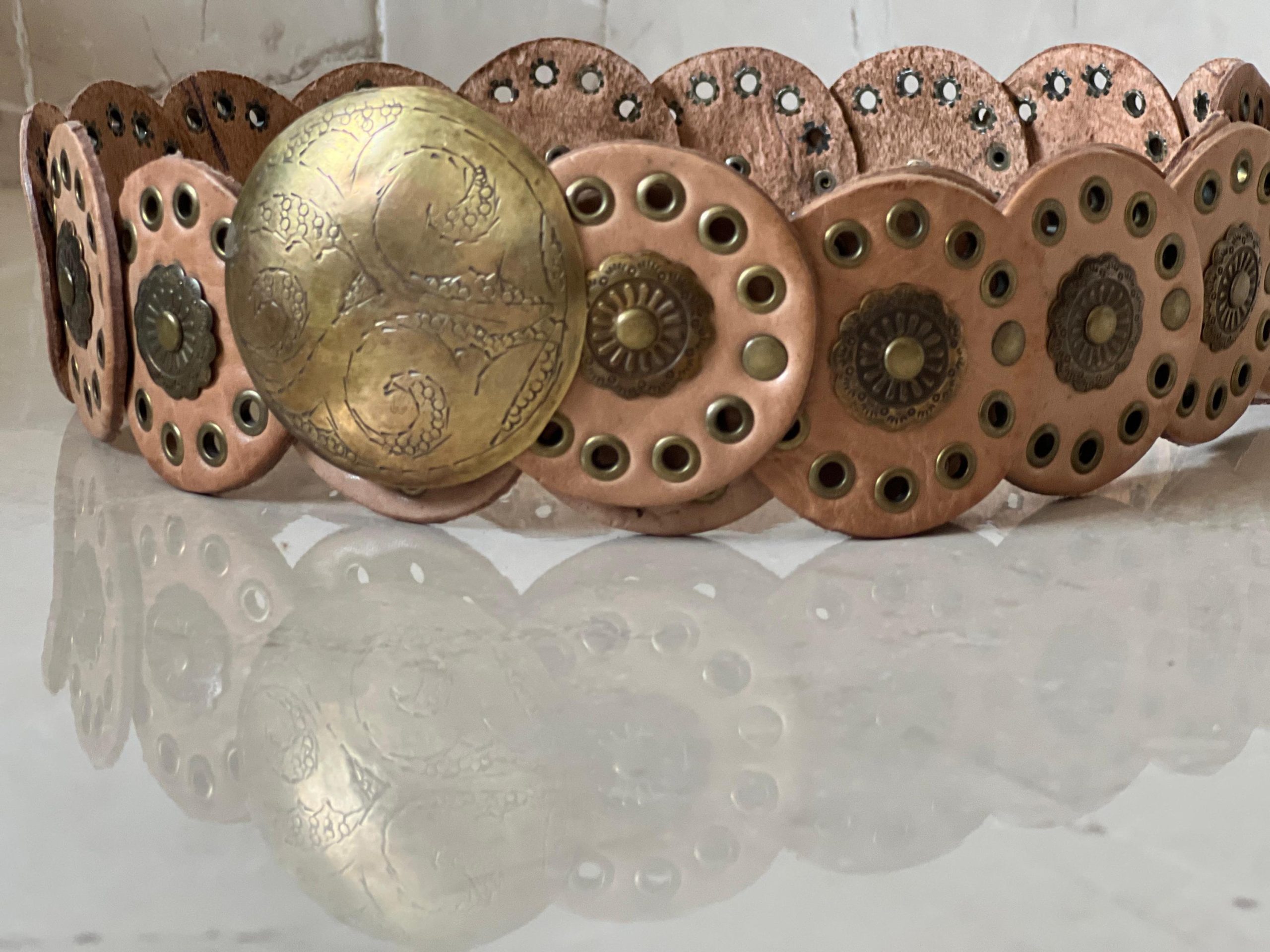 🎁 A unique gift idea – this handmade Moroccan leather concho belt (107 cm / 42.1 in) blends artisan quality with vintage style. The engraved bronze buckle and decorative round studs make it perfect as a medieval belt, studded waist belt, or stylish halloween costume belt.