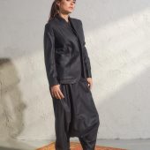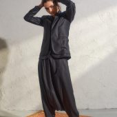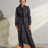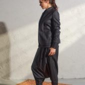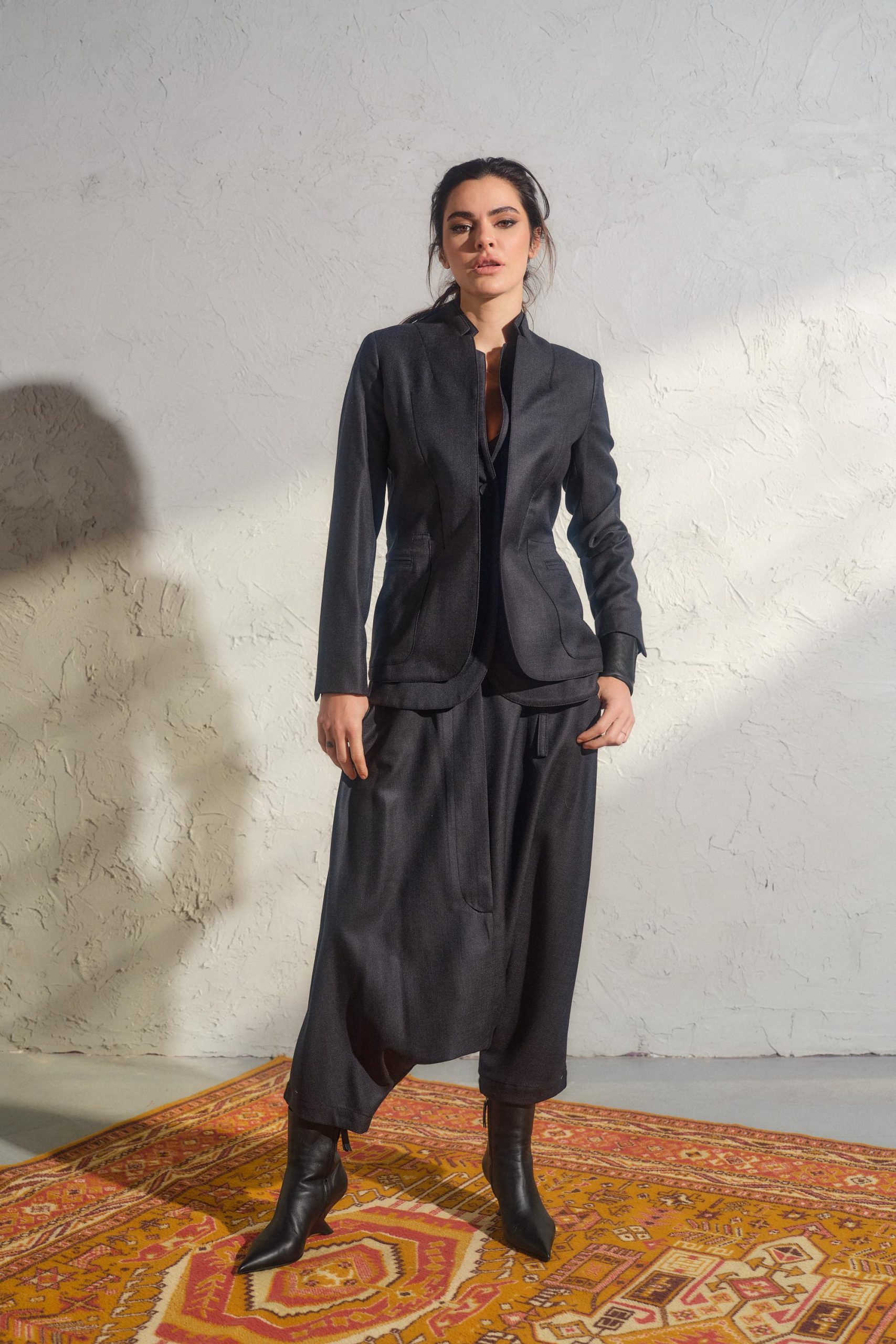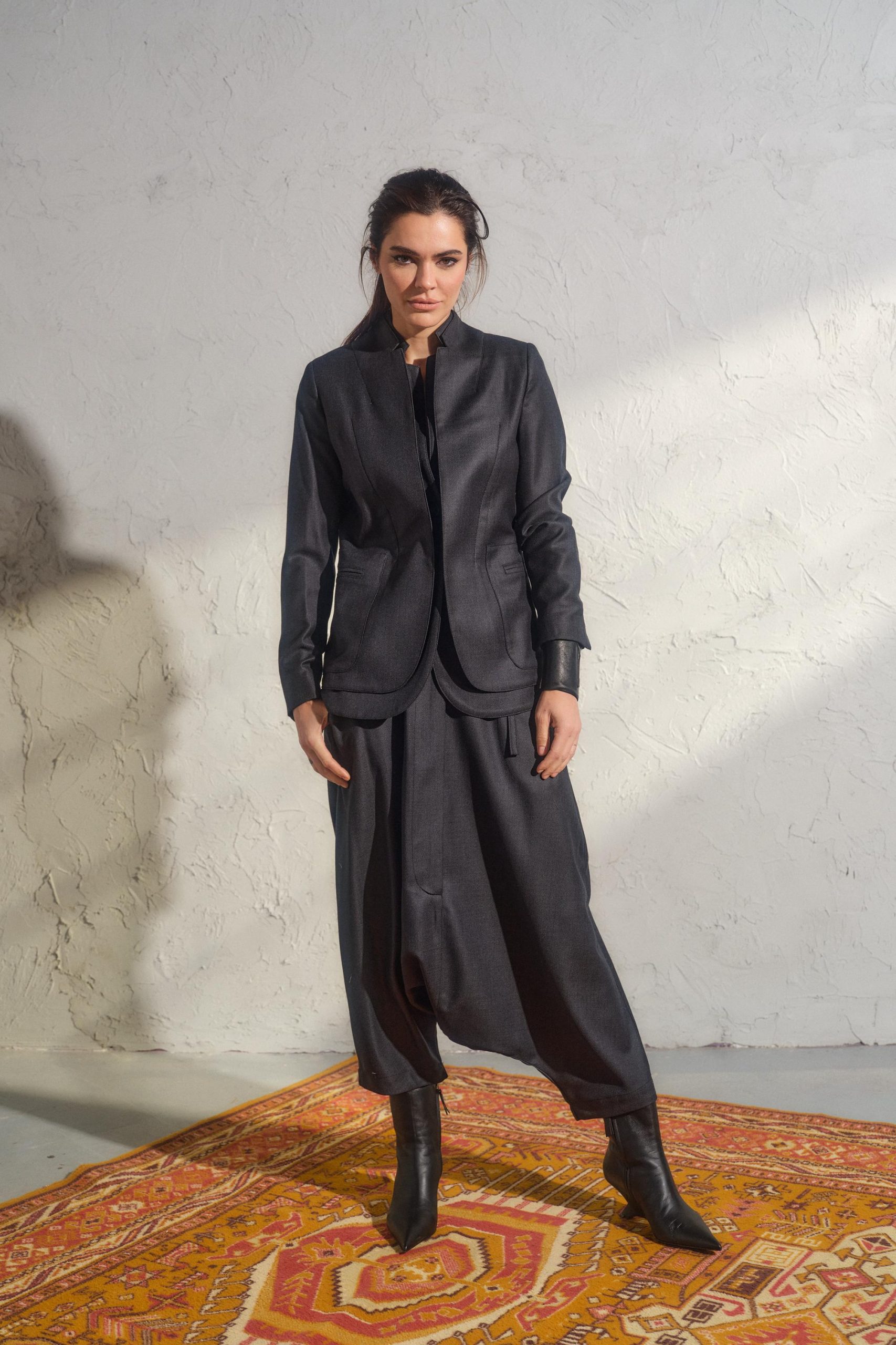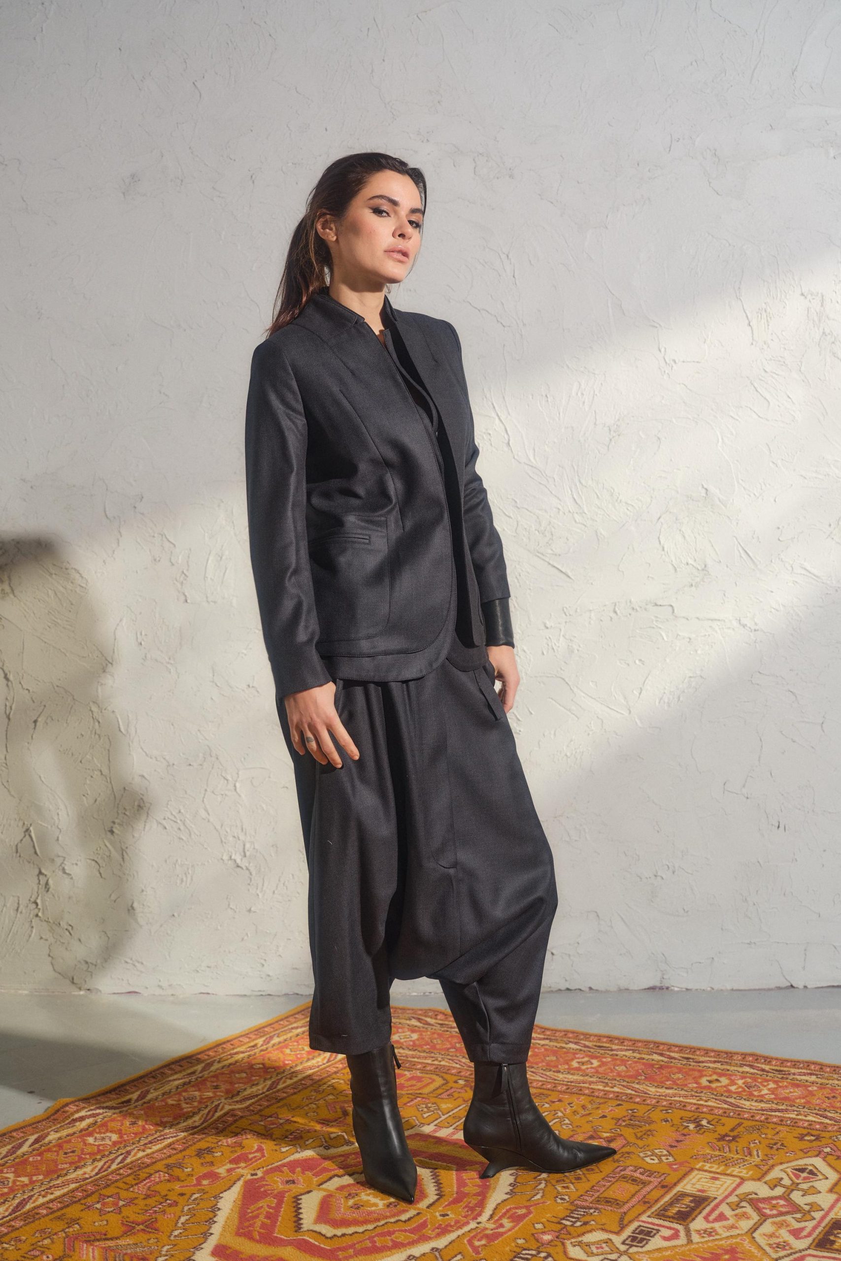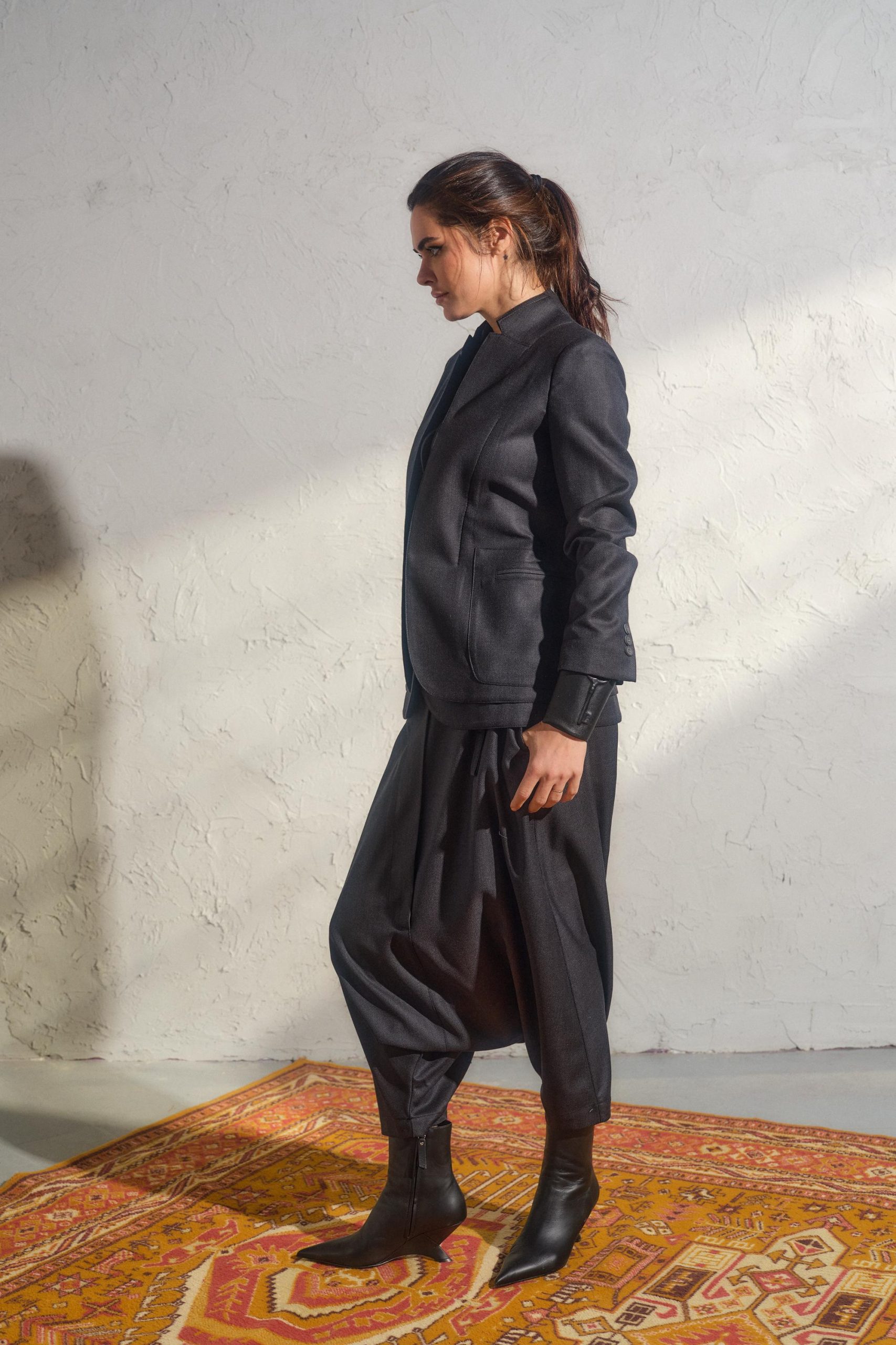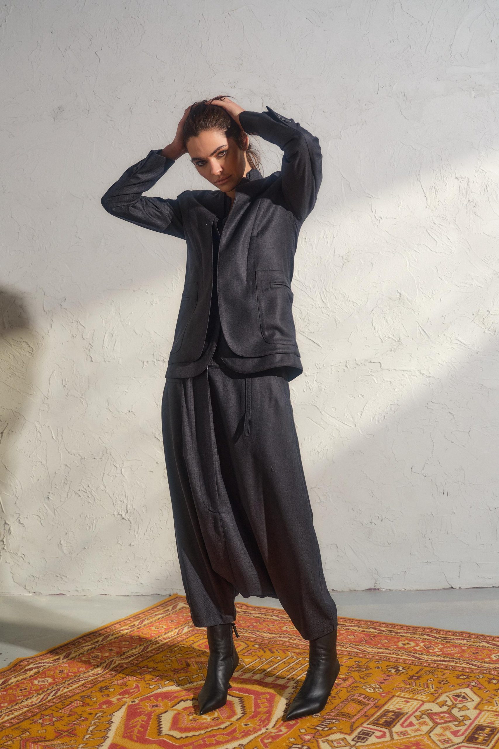 The matching baggy pants bring relaxed elegance through their drop-crotch shape, zipper closure, asymmetrical details, and functional pockets. Crafted from lightweight cool wool, they offer comfort, breathability, and a sculptural drape ideal for both everyday wear and standout moments.